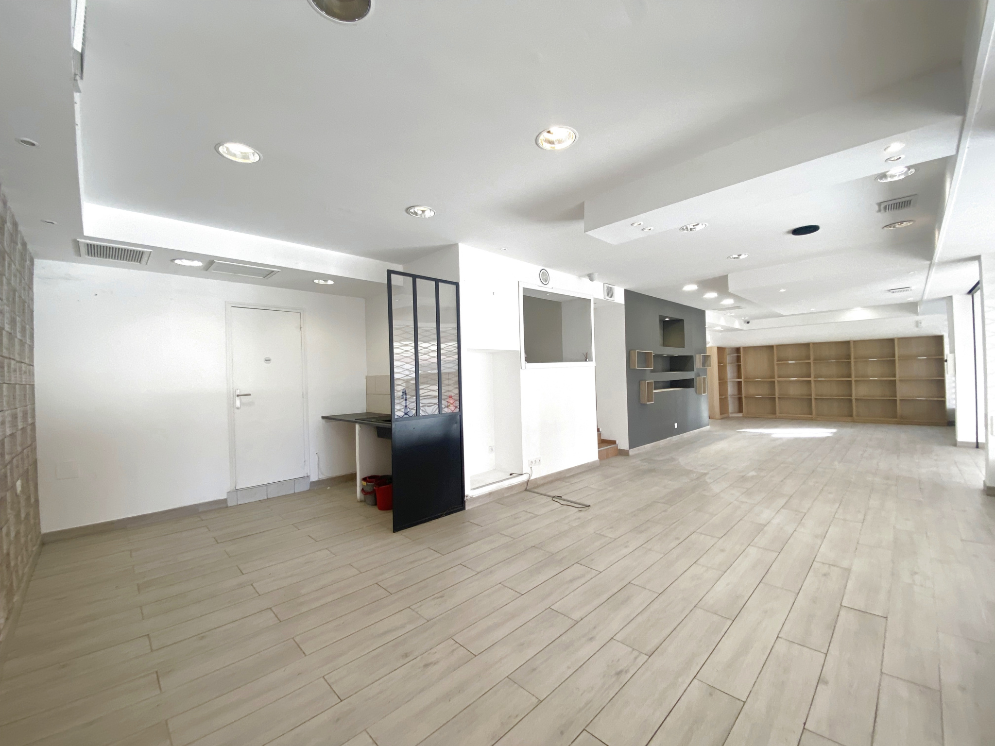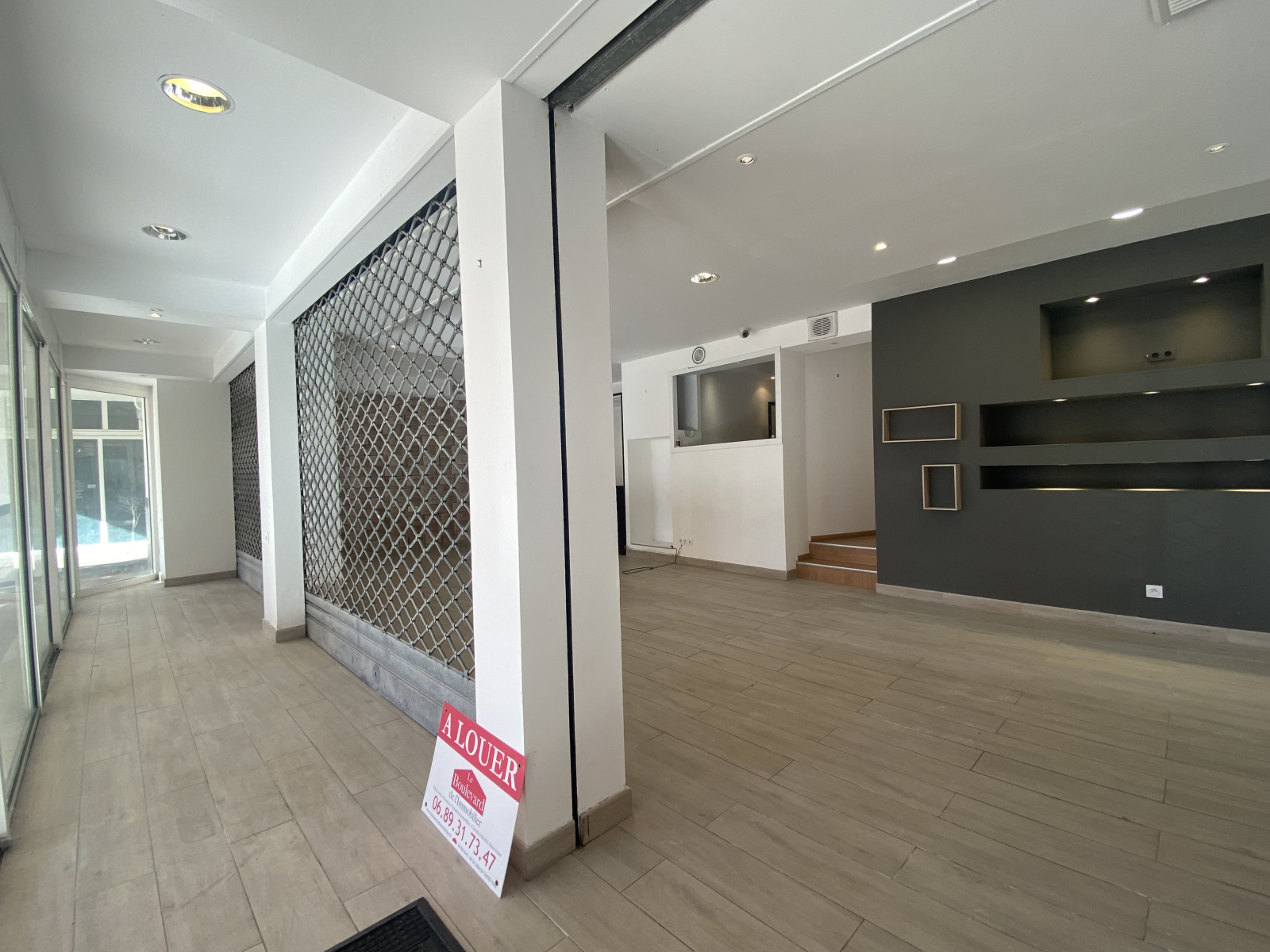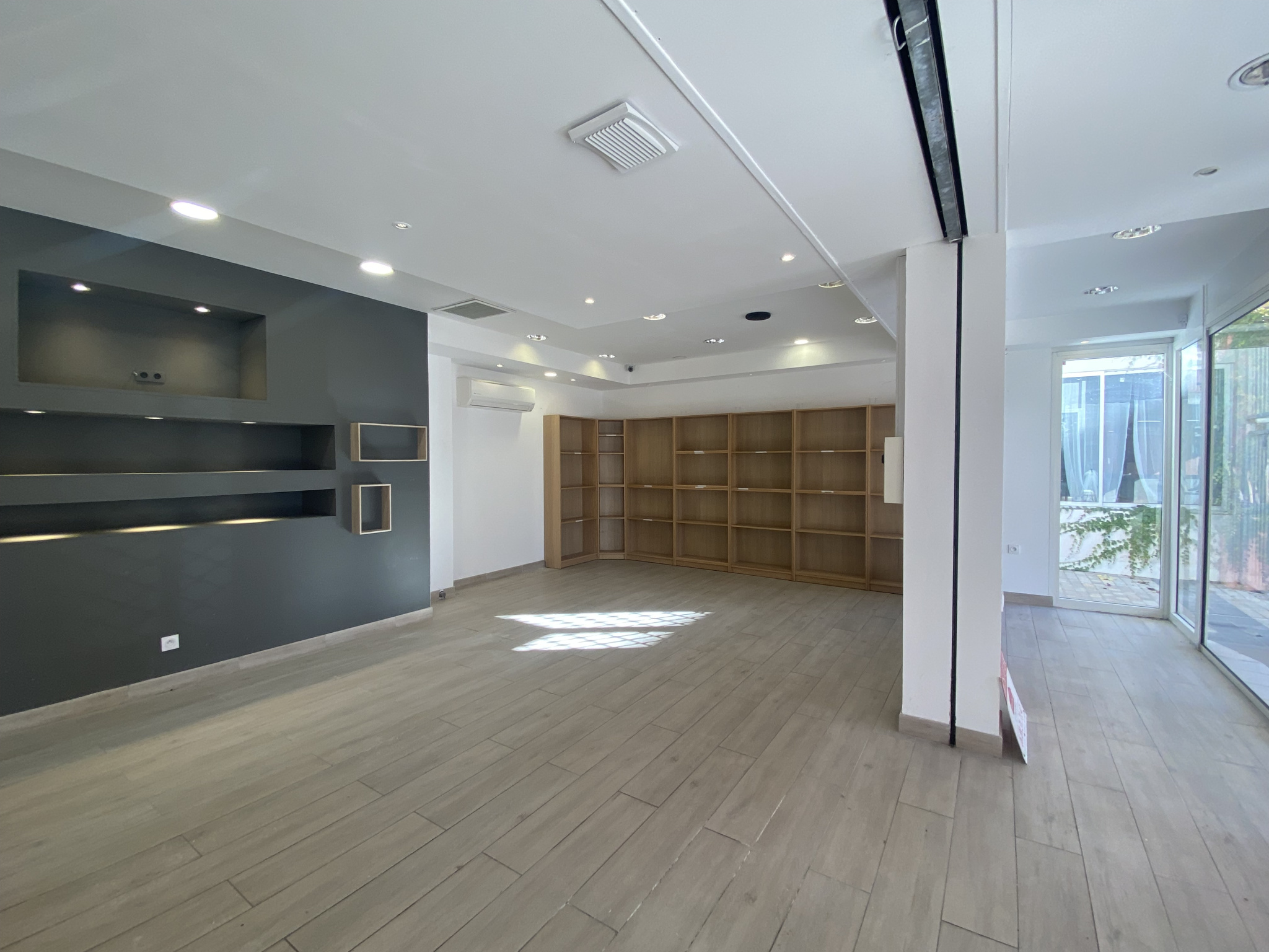 Longueur vitrine 13,85m; climatisation réversible, 4 rideaux métalliques électriques